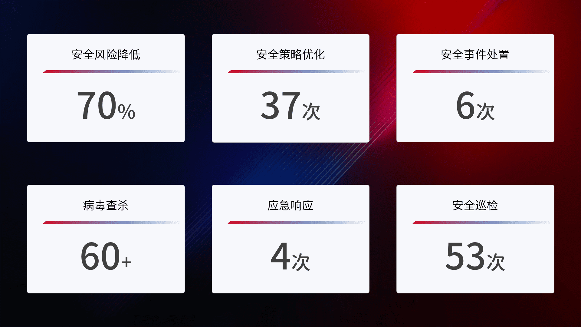 提供全面的安全事件报告体系,,,包括处置报告、、、周报、、、季度和年度总结,,结合持续监控,,,,帮助客户深入了解网络安全状况。。。