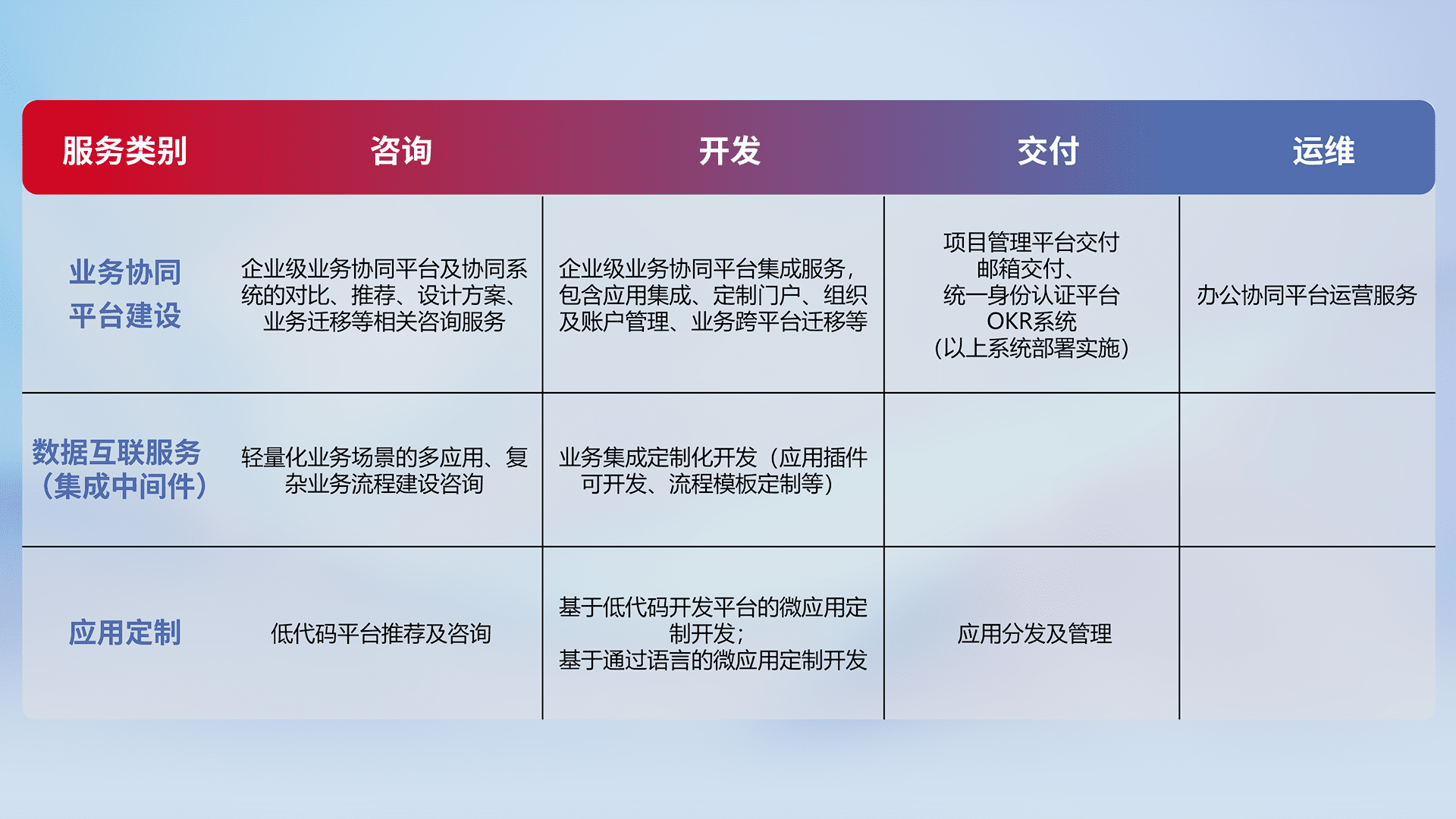 针对钉钉、、、企微、、、IDaas等平台级产品提供产品的规划、、、方案、、、交付、、定制化开发等服务,,实现如统一协同办公、、智能客户服务、、混合会议管理、、、、智能数据查询、、、、等业务场景,,,实现数字化转型。。。