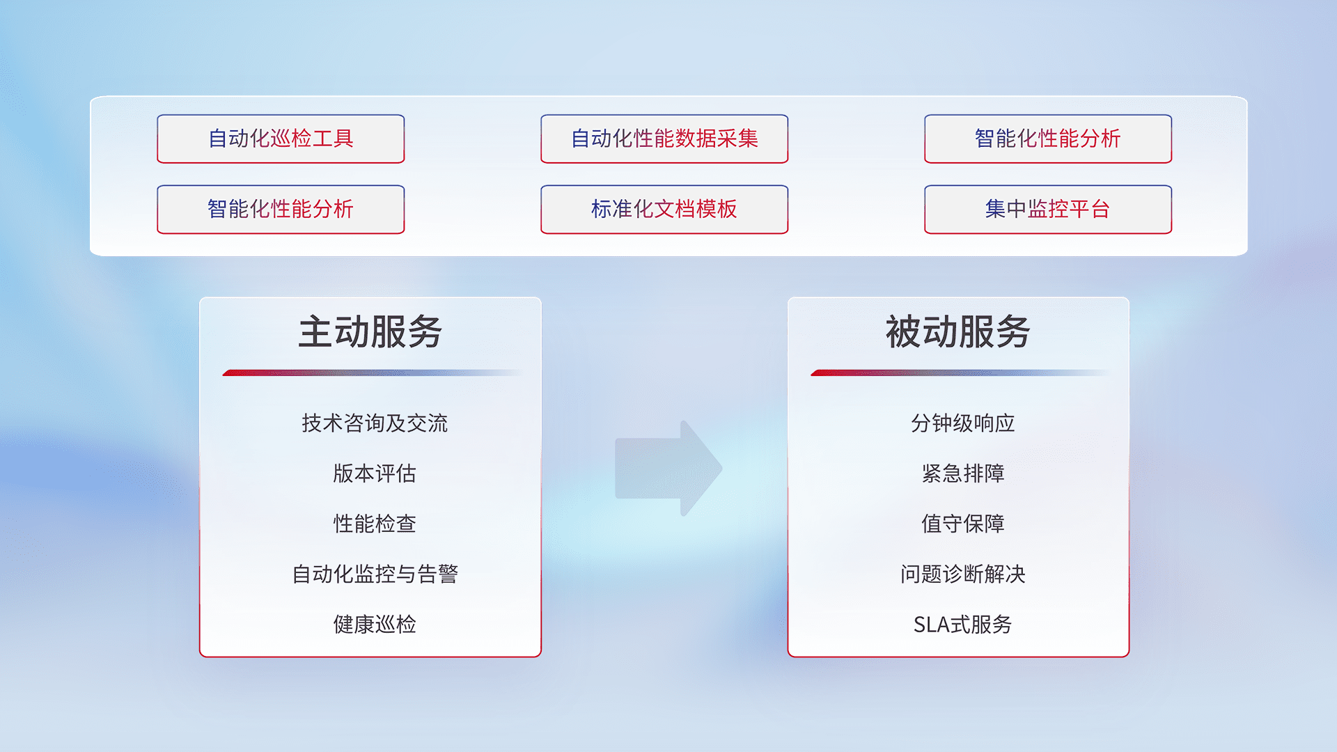 智能化工具和标准化文档,,保障服务质量,,,提供主动服务(包含技术咨询、、、版本评估、、、、性能检查、、、、自动化监控与告警、、、、健康巡检)和被动服务包含(分钟级响应、、、、紧急排障、、、、值守保障、、、、问题诊断解决、、、、SLA服务)。。。。